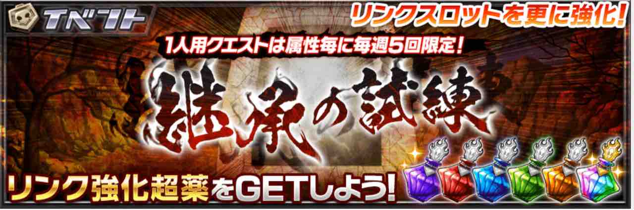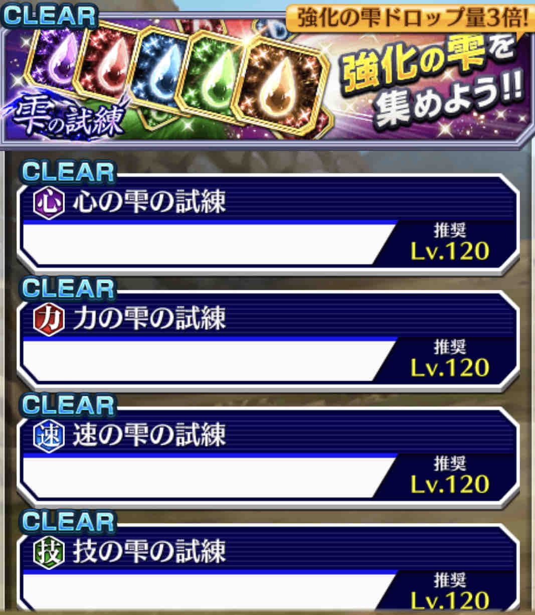 雫の試練と違うのは、道中にボスがいたり難易度が高くなったこと。報酬に全属性の雫がドロップする事など。アクセ、リンク、継承をしっかりすると、難なくクリア出来る。ここでも雫ドロップupキャラが活躍する。
