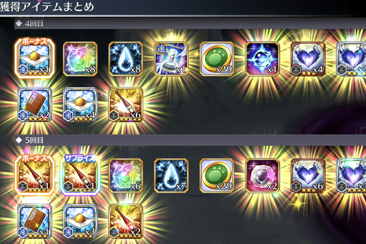 まず極限共闘メダルが獲得できます。これを集めることで、交換所にて貴重なアイテムと交換できます。また強化石、各属性の雫、各属性の粉塵、アイテム強化アイテムなどが獲得可能です。簡単に例えるならば、ここも【塵も積もれば山となる】です。