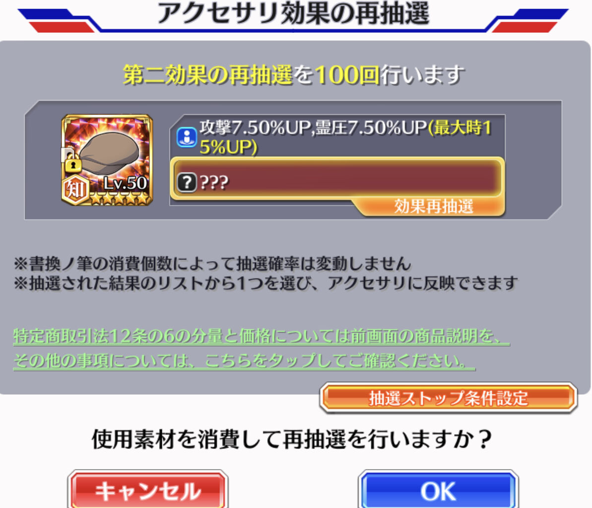 アクセサリの「二次抽選」には、星5アイテム(レベル1の未強化でも星5ならOK)、書換ノ筆、書換ノ筆・極のいずれか1つが必要となります。