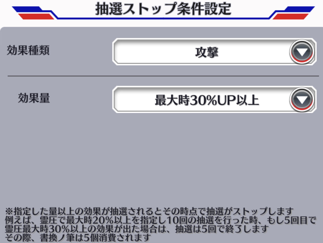 この画面で右下の「抽選ストップ条件設定」をタップ