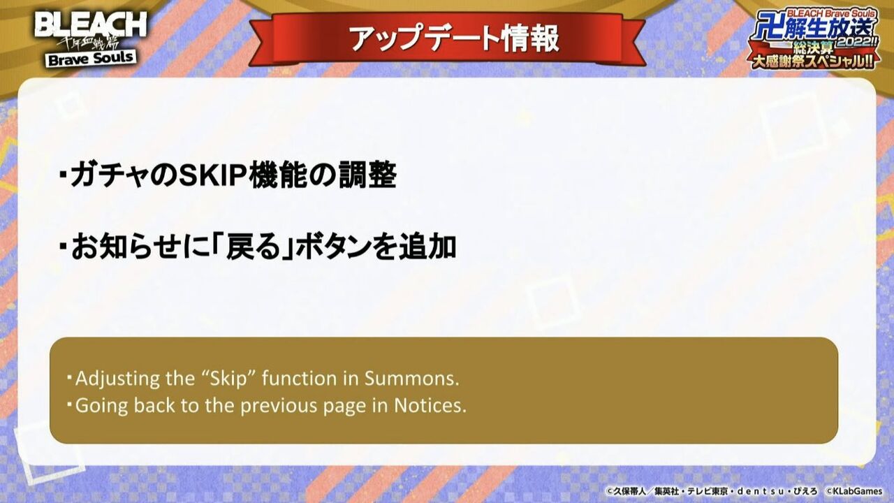 この記事は【卍解生放送】において公開された新情報、アップデートなどをまとめた記事となります。