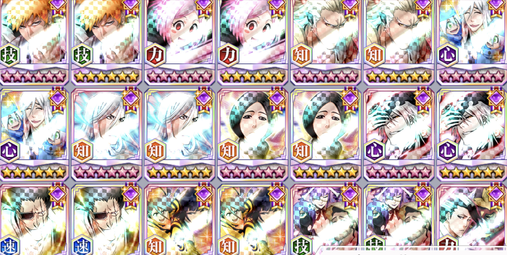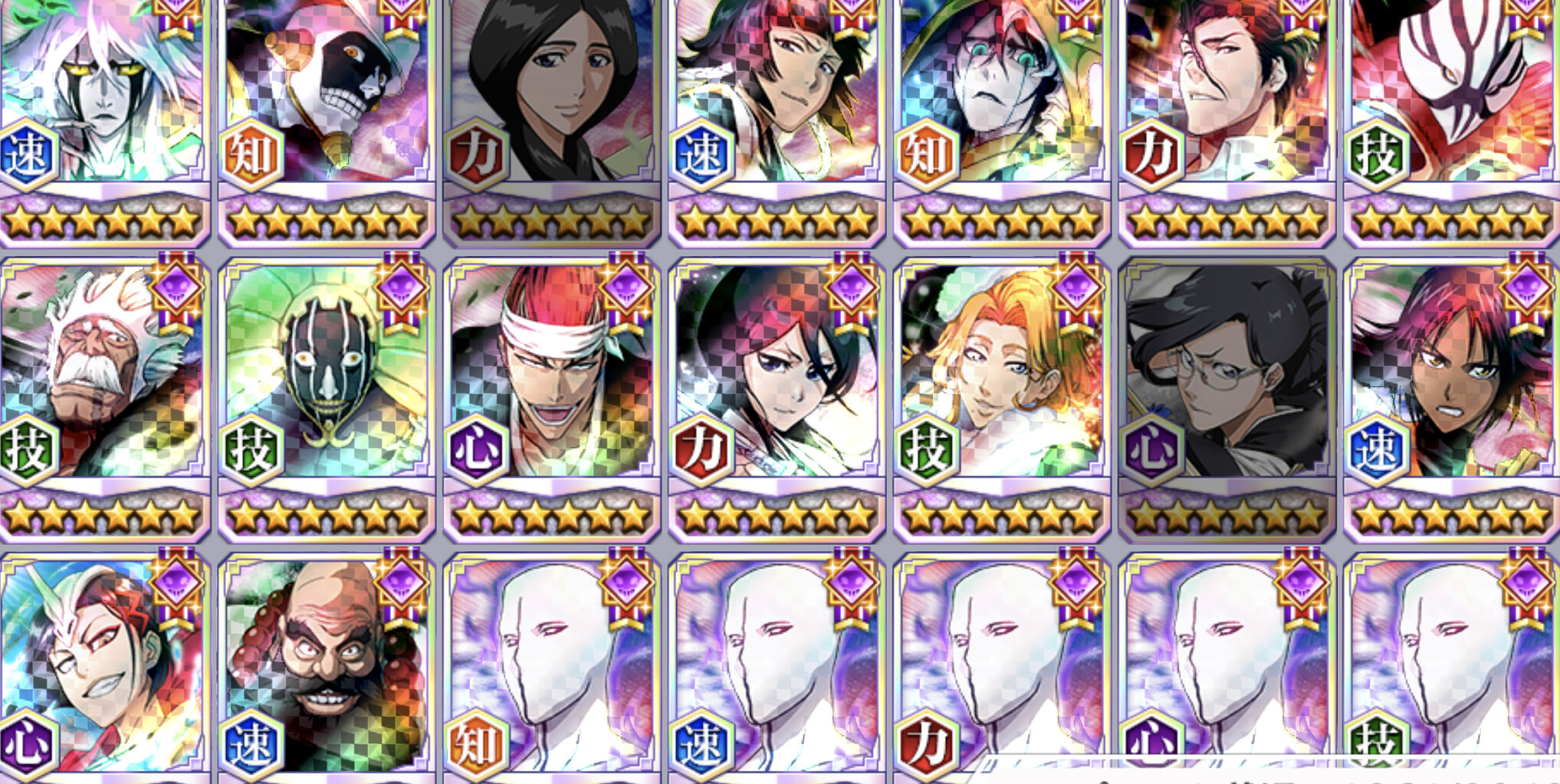 バフ役には、赤攻撃ではあるが伊勢七緒(千年血戦篇)、更木剣八(速)や、破面キラー青攻撃の藍染惣右介(千年血戦篇リメイク)、朽木ルキア(春節)、毒ヶ峰リルカ(速/転生)をおすすめ。