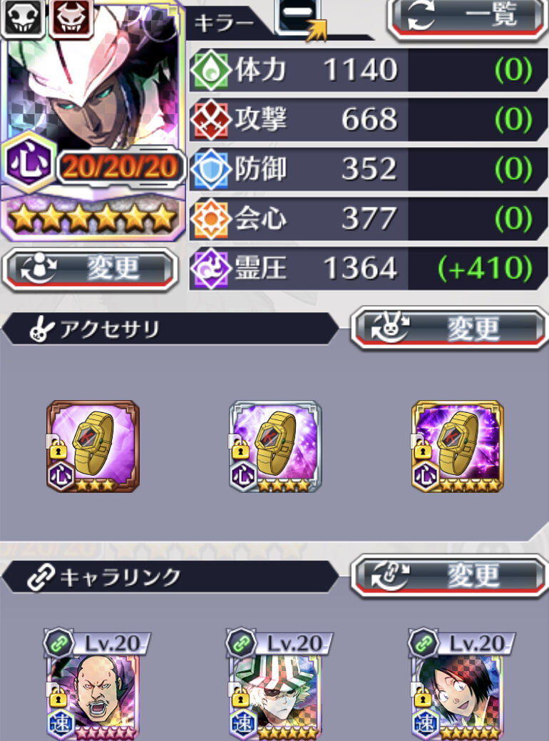 私は強化石、強化晶、環、雫、リンク強化薬、リンク強化超薬とバランスよく入手したいので、東仙要にこのようなアクセサリとキャラリンクをしています。