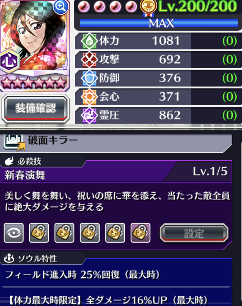 ルキアは心属性の通常特化キャラ向けのリンク要員に。回復かつ体力最大時全ダメージupは嬉しい