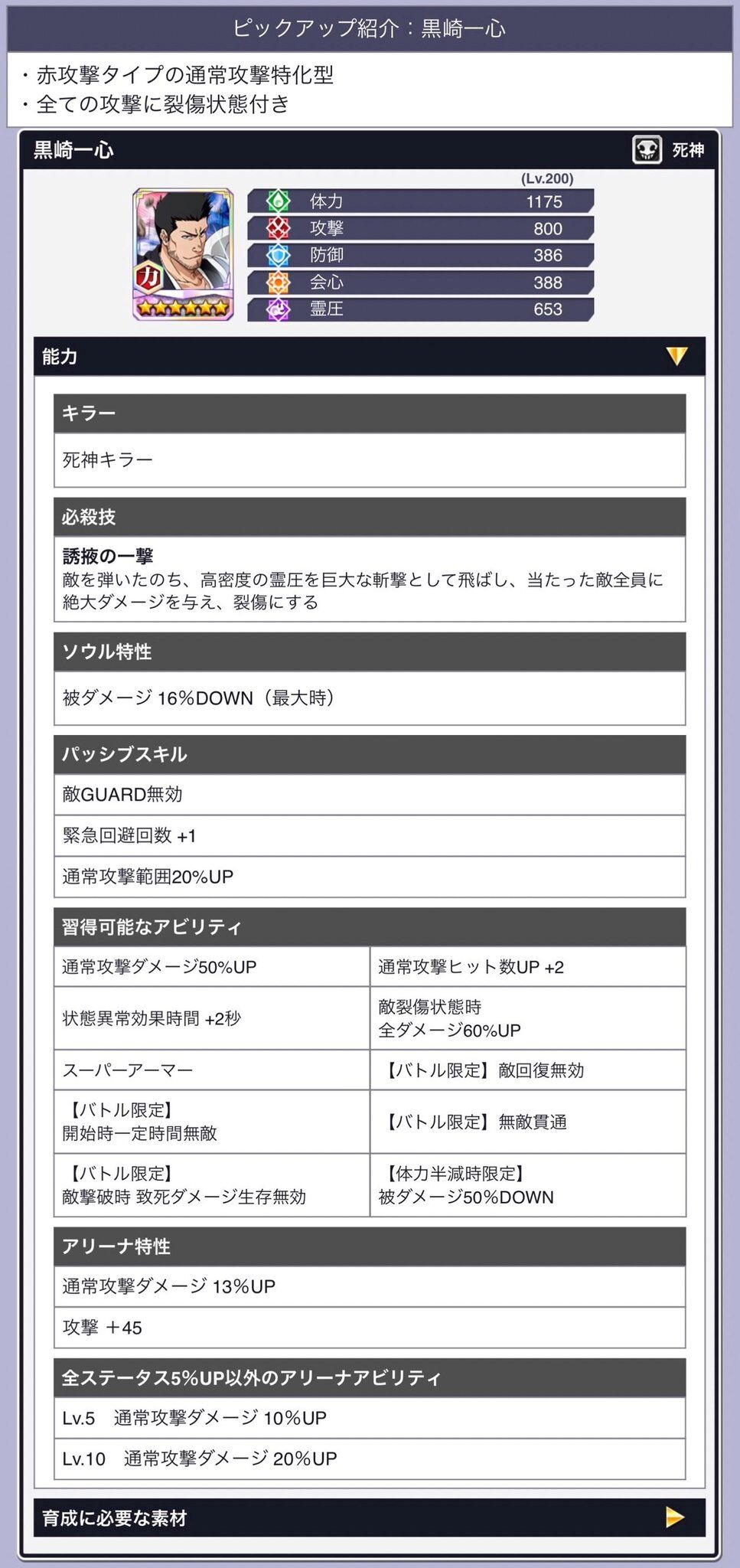 主力アビリティ【クール短縮12%】【緊急回避回数+2】【強攻撃範囲20%up】【体力最大時限定:全ダメージ20%up】【通常攻撃20%/強攻撃40%/必殺技40%】【強攻撃ヒット数+2】【敵ガード無効/青攻撃無効貫通】【状態異常付与時一定時間霊圧80%up】【速属性への状態異常確率up】【チーム/パーティー:技属性の強攻撃ダメージup20%】新アビリティ【チーム/パーティー:フィールド進入時技属性の強攻撃クールタイム回復20%】