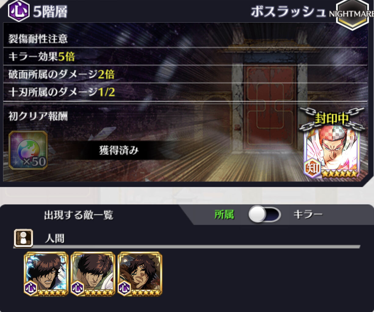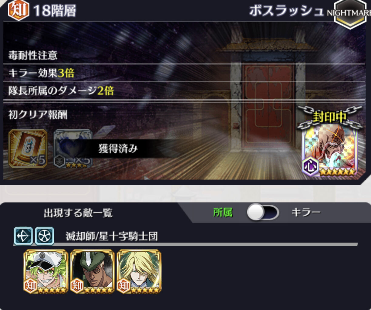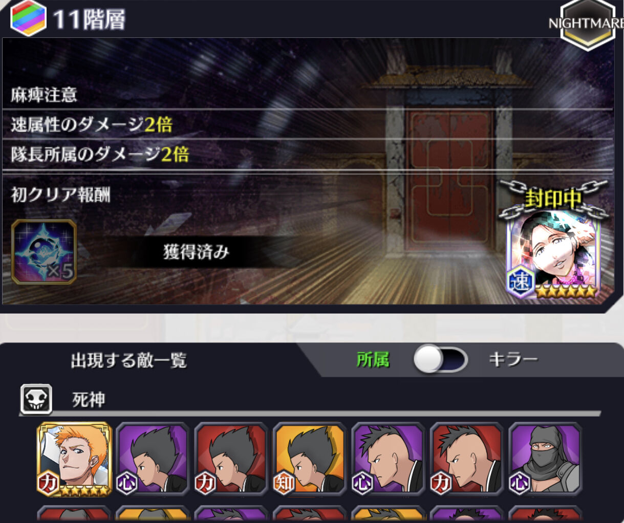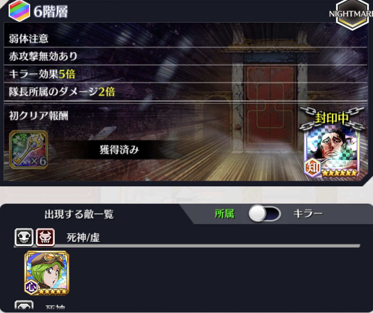 通常攻撃封印注意/キラー効果3倍/死神所属のダメージ2倍/隊長所属のダメージ1/5