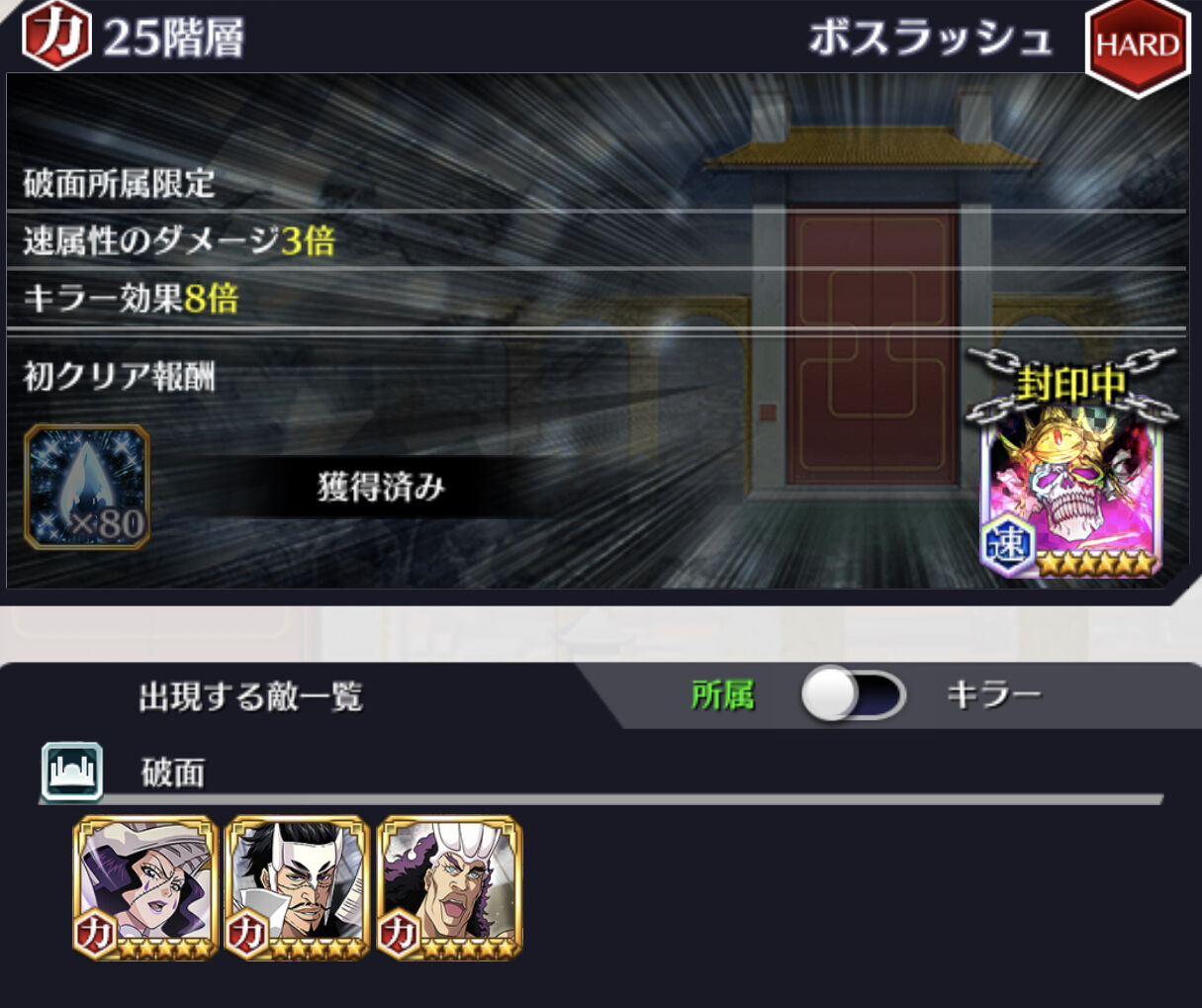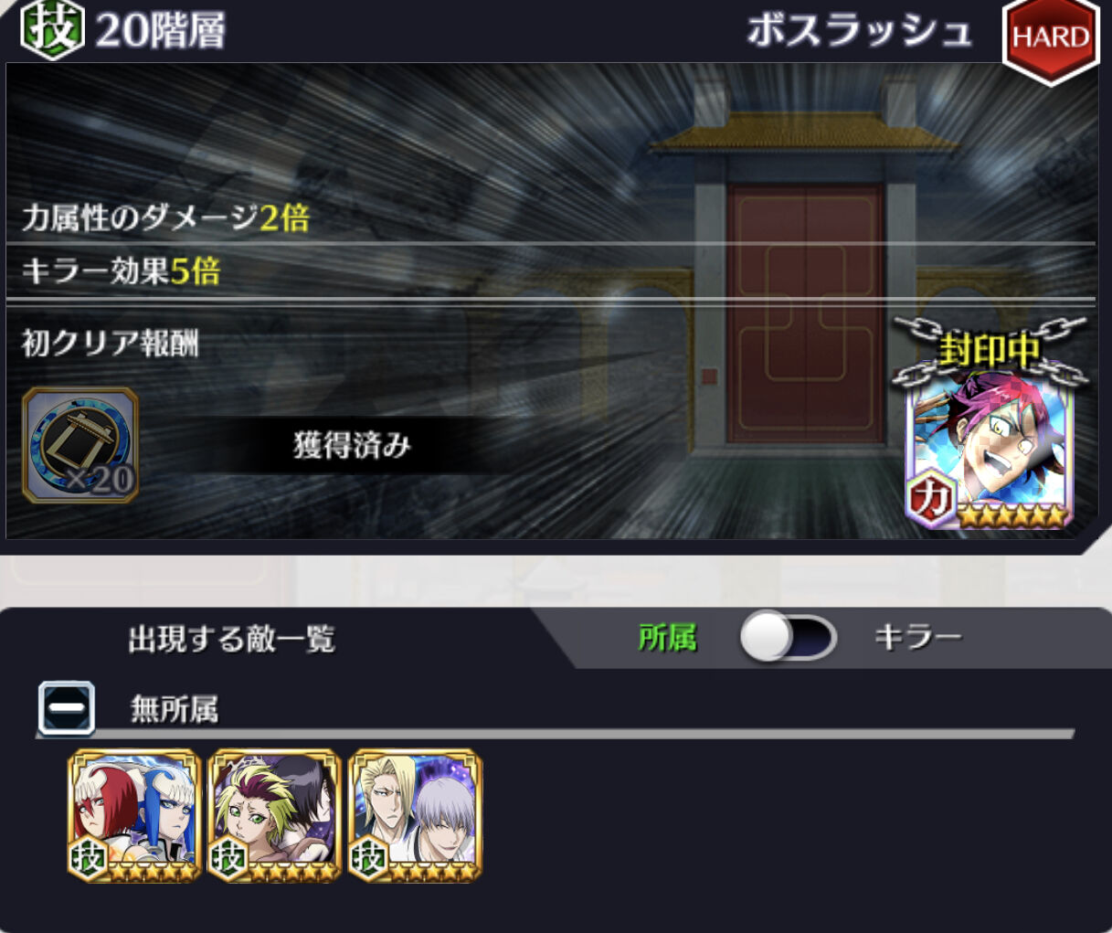 最初の壁は30階のボスラッシュあたり【心属性・破面】だろうか。私の場合は条件無視で、白一護(カカオ)のキラーと霊圧のみで討伐している。