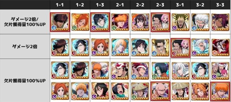 ※2-1に関しては★5志波岩鷲がレアメダル交換所にある為、例に挙げたように★6黒崎一護(技)がいれば、志波岩鷲を工夫してボナキャラ3体になります。
