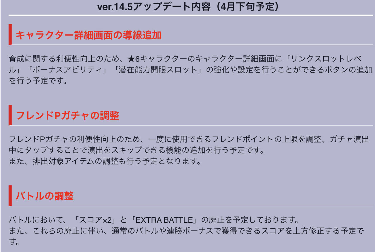 また「★4降臨クエスト」「★5降臨クエスト」の廃止も発表された。またそれに伴い「降臨キャラ」「開放ノ鍵」も廃止が発表された。