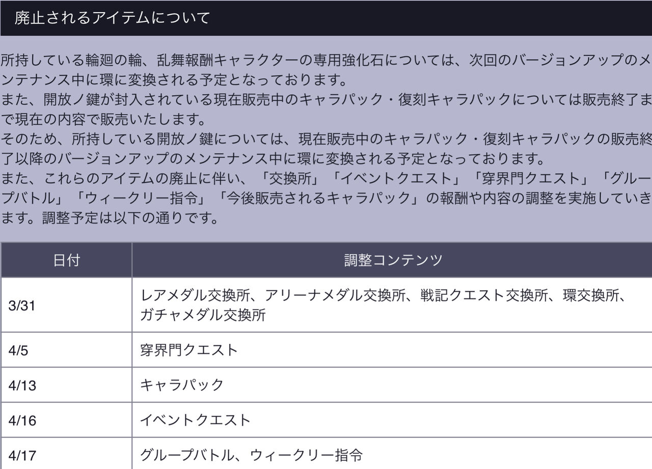 「輪廻の輪」「専用強化石」「開放ノ鍵」は廃止されるため、メンテナンス中に環へ変換される予定。