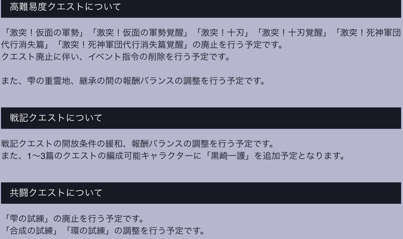 さらに共闘においては、「雫の試練」の廃止も発表された。その上で「合成の試練」「環の試練」の調整も発表。