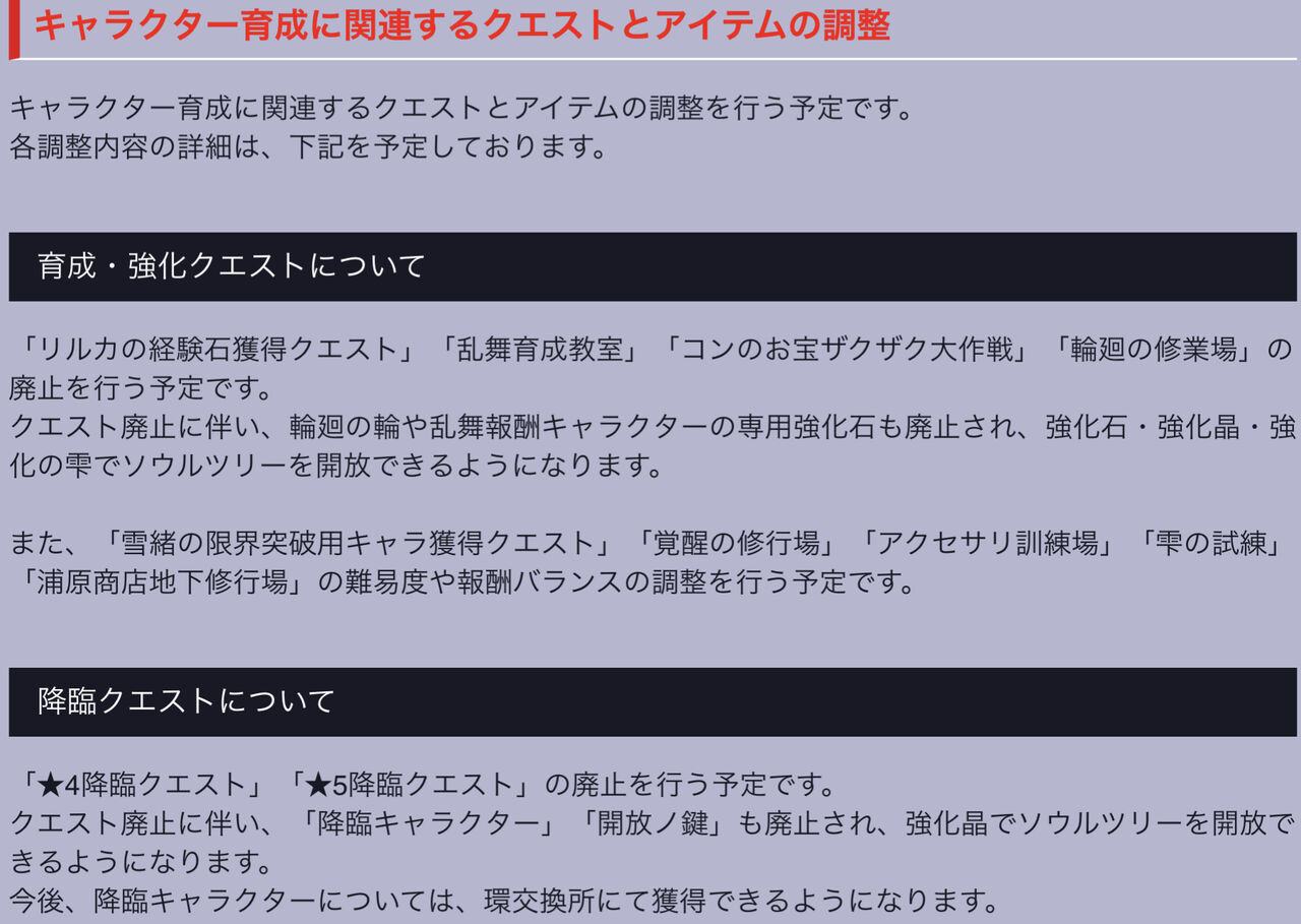 「リルカの経験石獲得クエスト」「乱舞育成教室」「コンのお宝ザクザク大作戦」「輪廻の修行場」のコンテンツの廃止。また「輪廻の輪」「乱舞報酬キャラクターの専用強化石」も廃止。