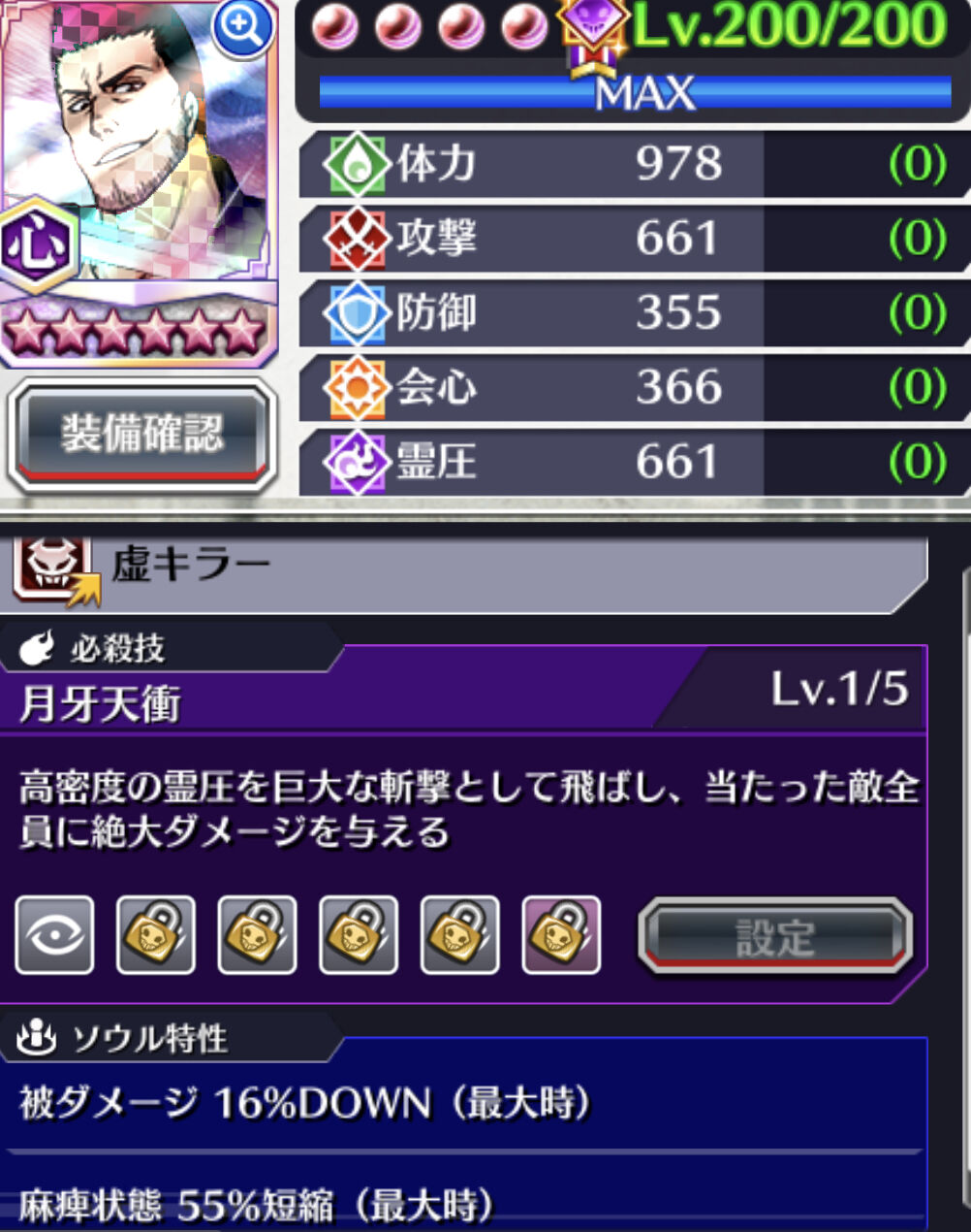 だが【被ダメ+麻痺短縮55%】のソウル特性を持つキャラは、ブレソルの全キャラでも、この心属性・黒崎一心の【被ダメ16%+麻痺短縮55%】の1体しか存在しない(2023/5/9現在)。
