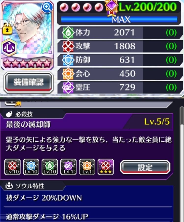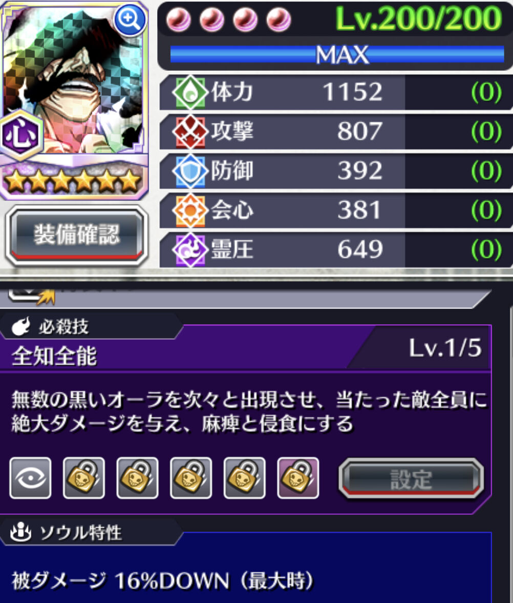 ソウル特性【被ダメ20%】の他に【体力半減時限定:被ダメDOWN50%】【バトル限定:開始10秒間通常攻撃ヒット数+1】【バトル限定:敵味方戦闘不能毎に通常攻撃ダメージup20%】【バトル限定:敵撃破時致死ダメージ生存無効】【バトル限定:無敵貫通】【バトル限定:開始時一定時間無敵】【心属性無所属への状態異常確定付与】【通常攻撃ヒット数+2】【スーパーアーマー】【敵バリア貫通】【麻痺短縮100%】とvs.ユーハバッハ(千年血戦篇リメイク)に対して有利なアビリティが山盛りである。