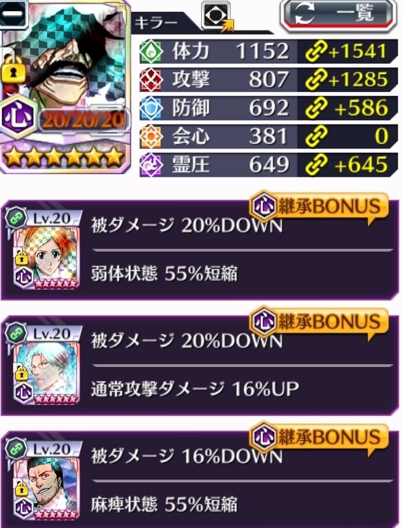 もし、一心が破れていても、相手に裂傷を与えることが出来たら、若山爺のボナアビ【敵裂傷状態時全ダメ40%】により、返り討ちにすることが可能となる。狛村でも同様。狛村が破れても裂傷を与えることが出来たら、若山爺で返り討ちにすることが可能となる。