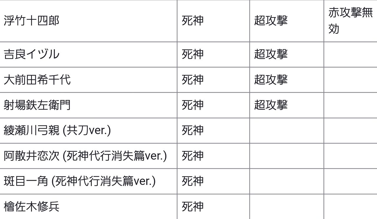※ウルキオラ(刀剣解放第二階層ver.)も青攻撃無効貫通キャラですが、通常攻撃特化キャラなのでおすすめキャラからは除外しました。