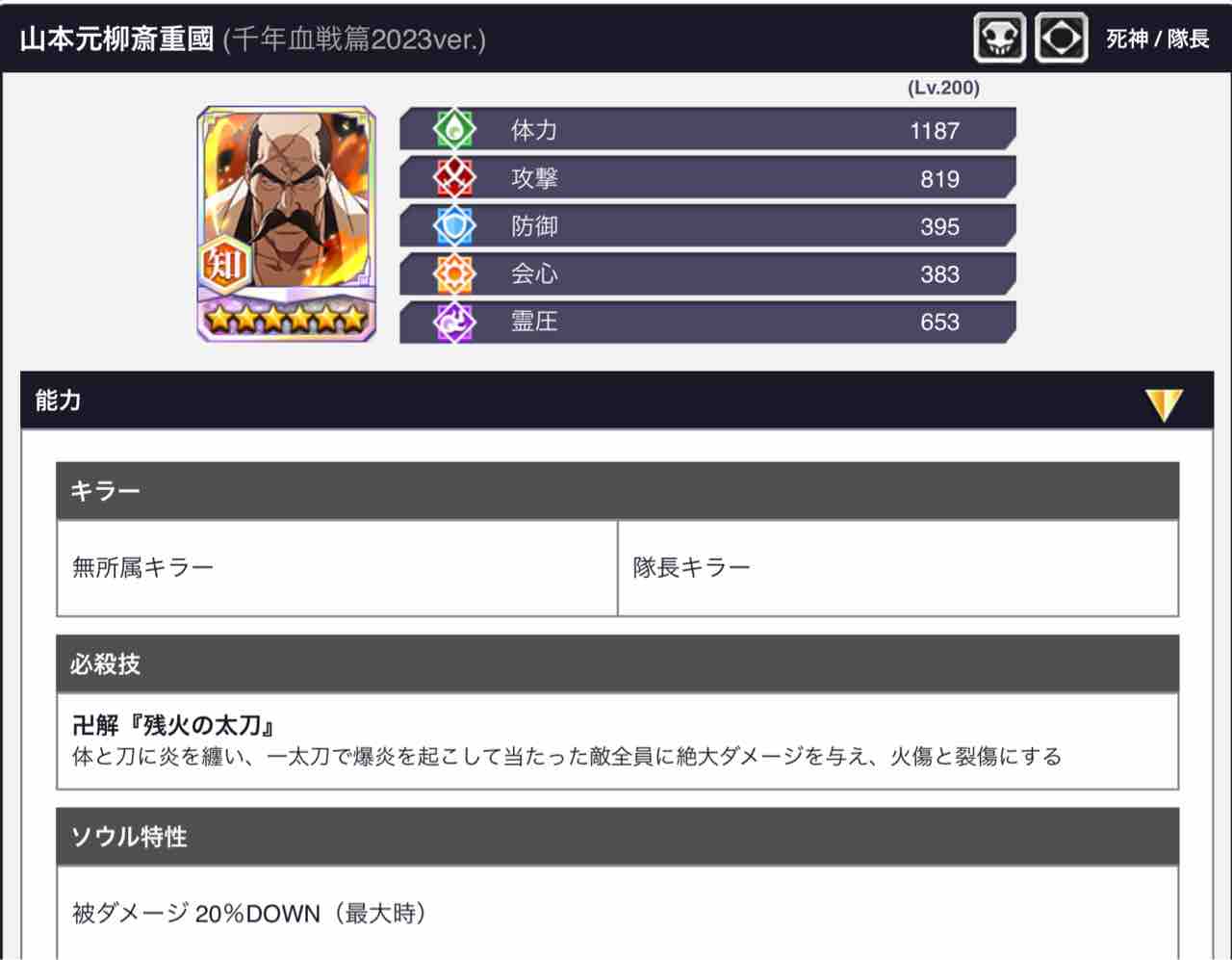 ※山本元柳斎重國(千年血戦篇)は、他に【速属性】と【技属性】がいますが、現環境においてロケットスタートをするキャラには値しませんのでご注意ください。