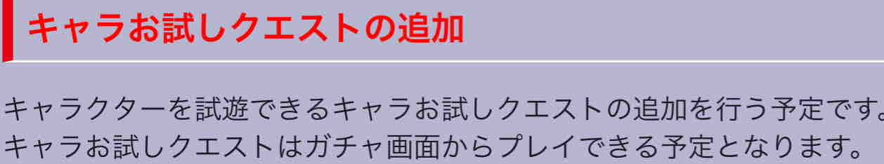 キャラお試しクエストの追加を行う予定です。