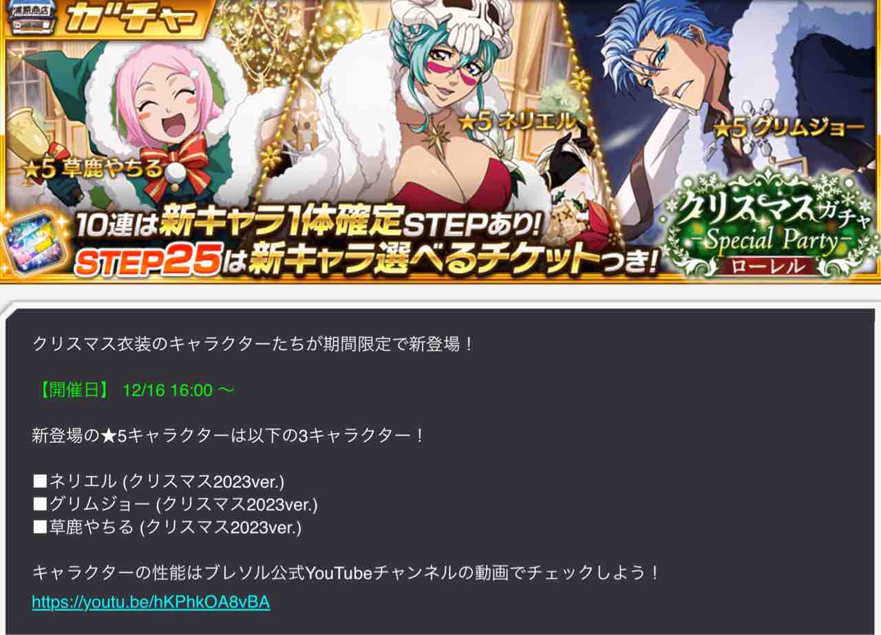 私見ですが、このガチャをスルーして年末ガチャに備える事を推奨します。または12/24の卍解生放送を見てから、回すかどうかを決めてもよろしいかと思います。