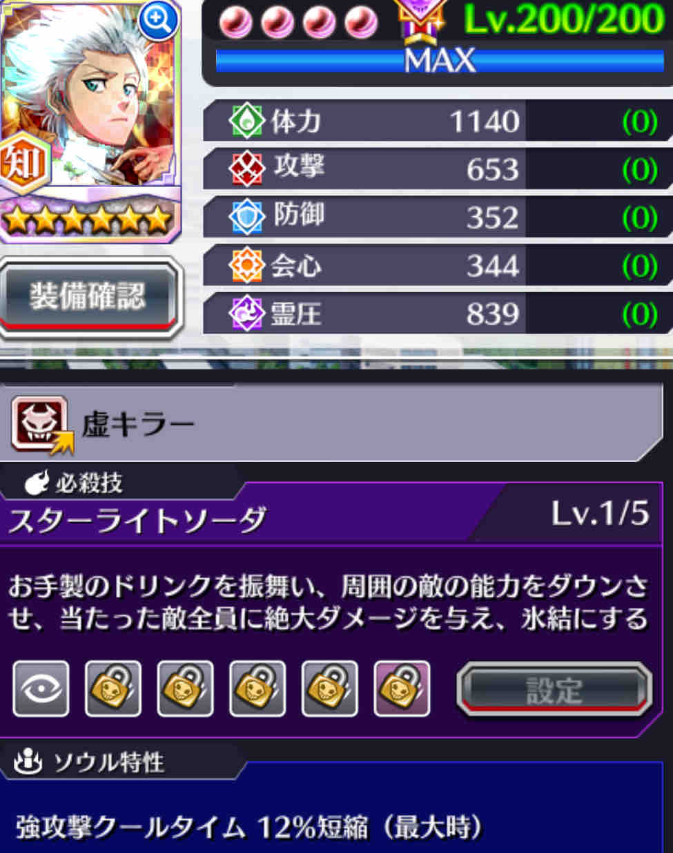 必殺技レベル5 ①霊圧 ②会心 ③攻撃 ④体力 ⑤防御