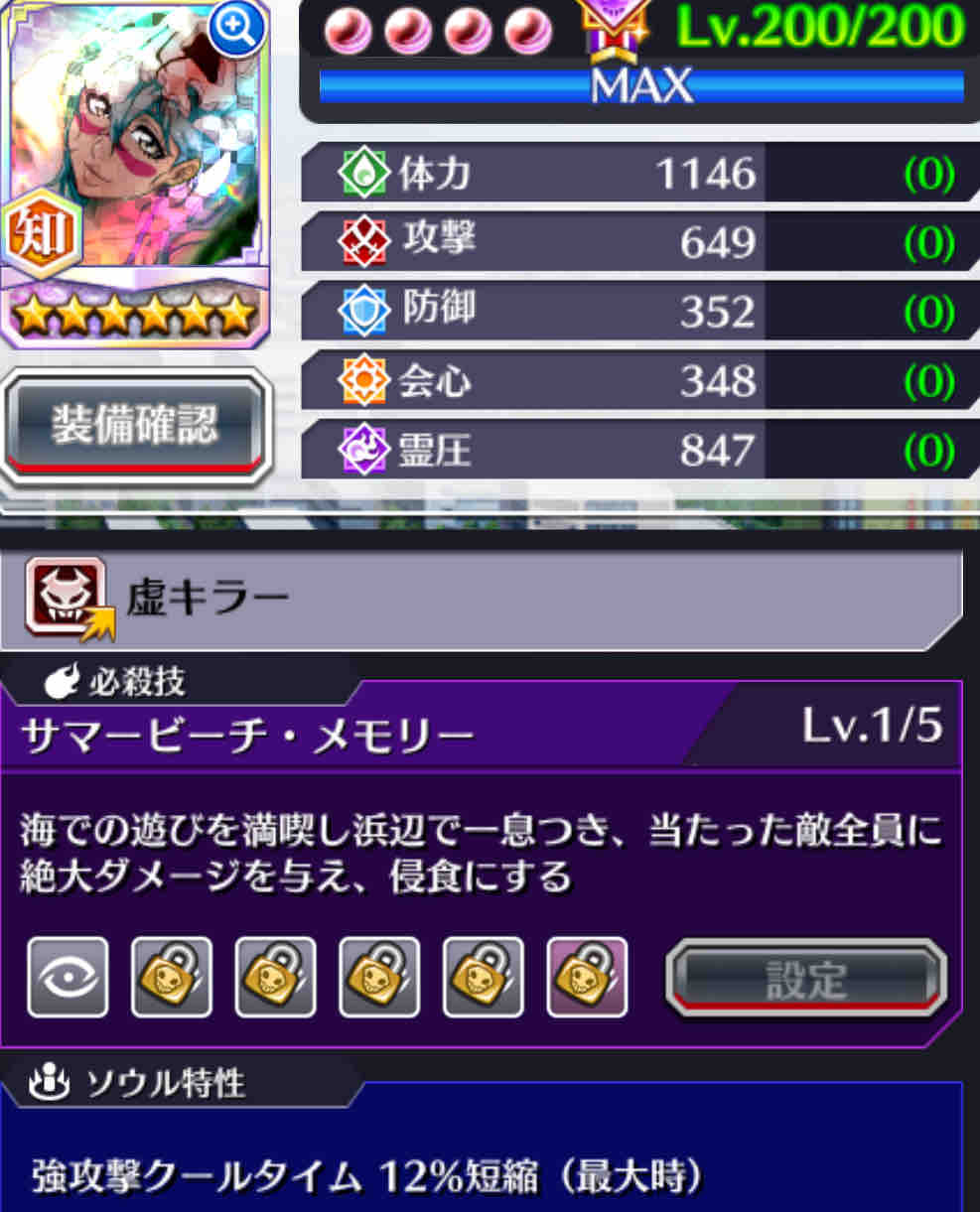 必殺技レベル5 ①霊圧 ②会心 ③攻撃 ④体力 ⑤防御