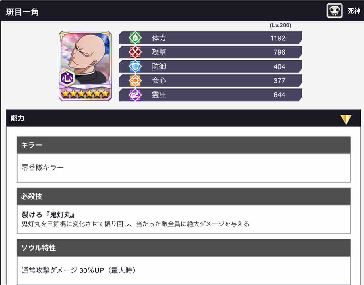 主戦場はグルバト「VERY HARD」滅却師・星十字騎士団キラー赤攻撃のサブ要員。射場鉄佐衛門には火力は求めず【チーム/パーティー】力属性死神が敵状態異常時全ダメ40%upにより、山本元柳斎重國(千年血戦篇リメイク)の火力底上げを狙う形となる。バリア発動により体力最大時も維持しやすくなるのはよい。