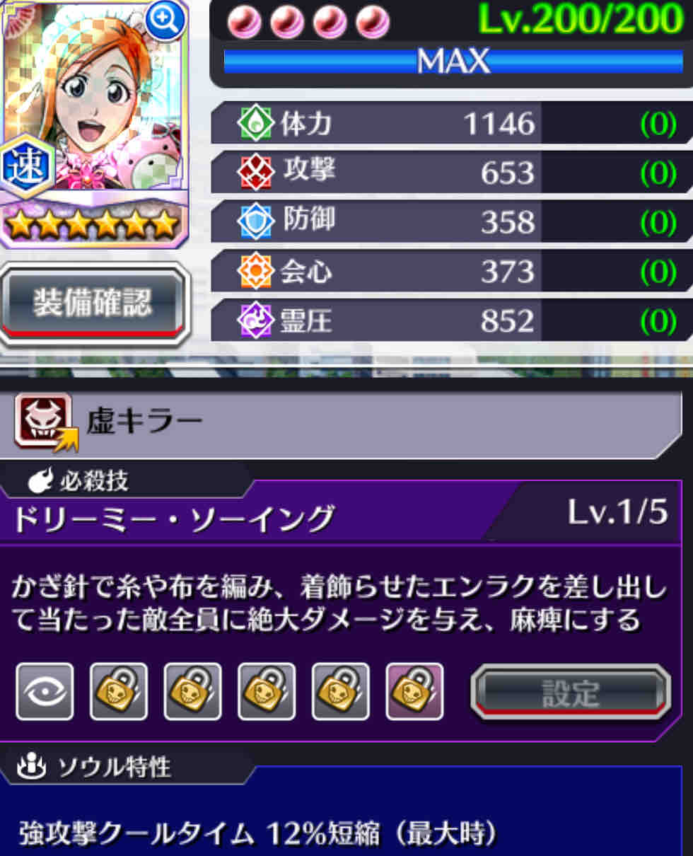 必殺技レベル5 ①霊圧 ②会心 ③攻撃 ④体力 ⑤防御