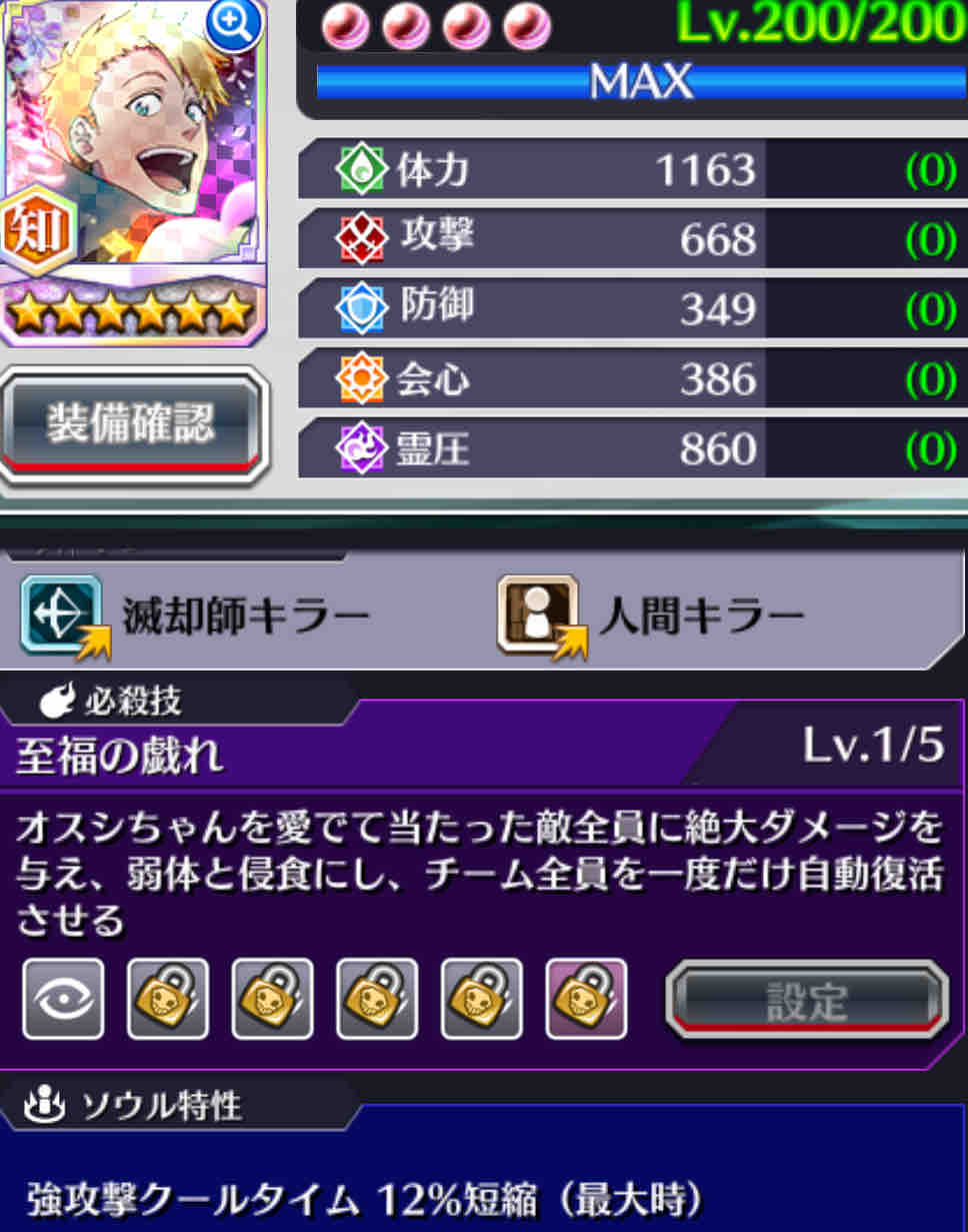 必殺技レベル5 ①霊圧 ②会心 ③攻撃 ④体力 ⑤防御