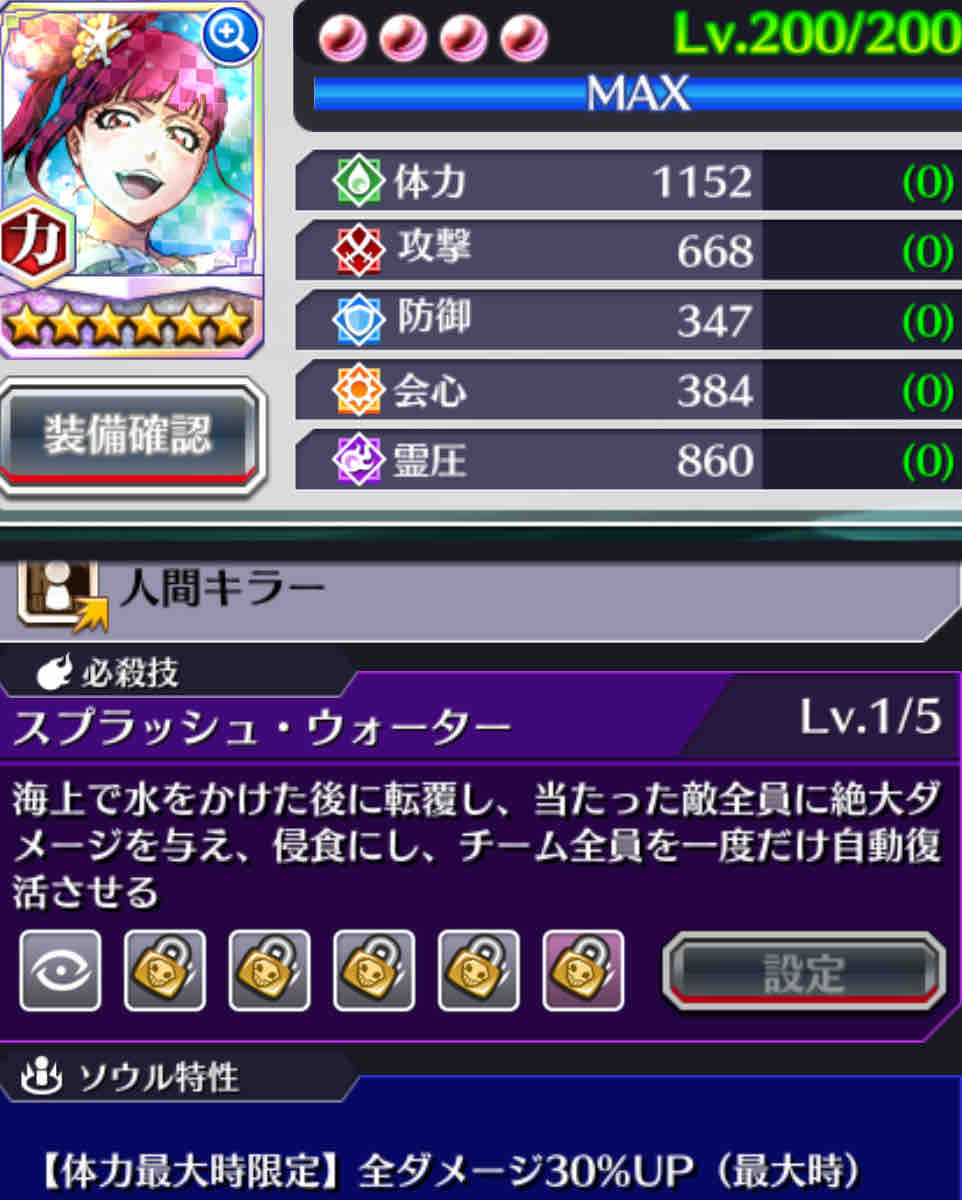 必殺技レベル5 ①霊圧 ②攻撃 ③会心 ④体力 ⑤防御