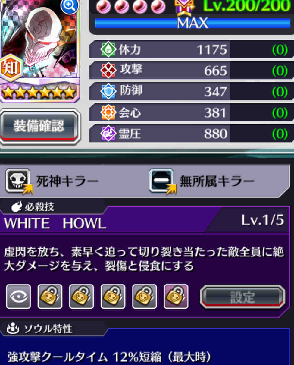 必殺技レベル5 ①霊圧 ②会心 ③攻撃 ④体力 ⑤防御