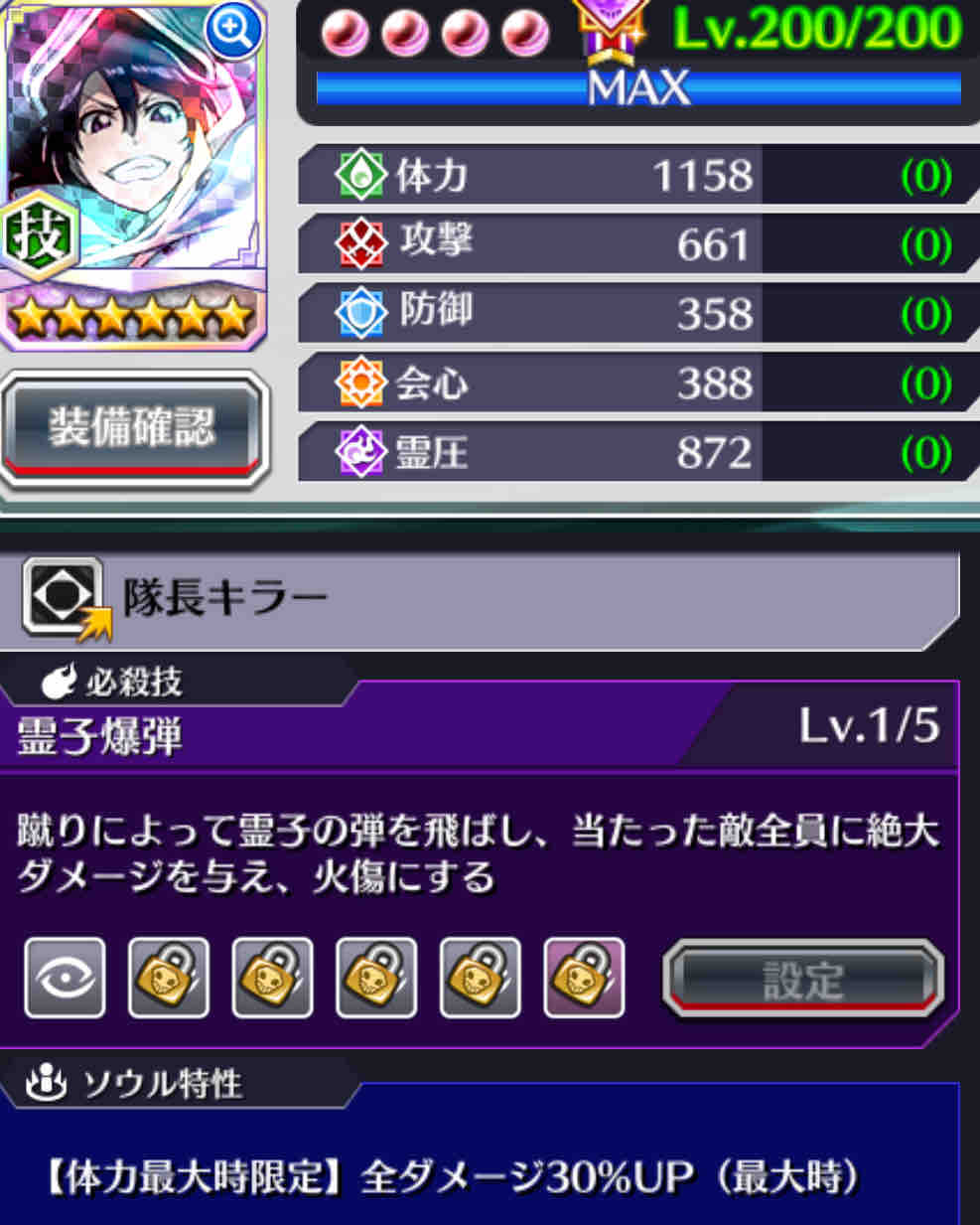 必殺技レベル5 ①霊圧 ②会心 ③攻撃 ④体力 ⑤防御