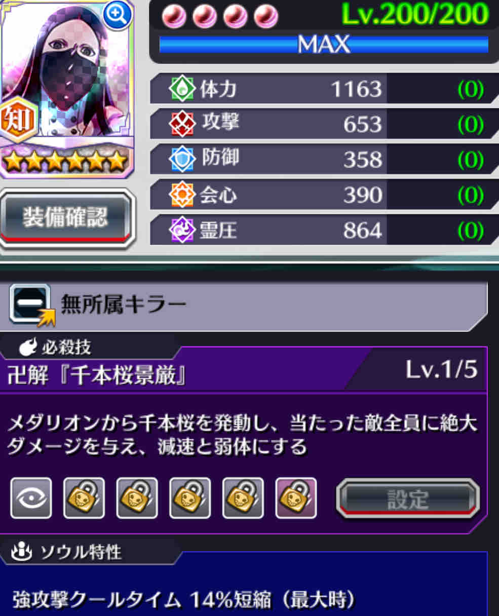 必殺技レベル5 ①霊圧 ②会心 ③攻撃 ④体力 ⑤防御