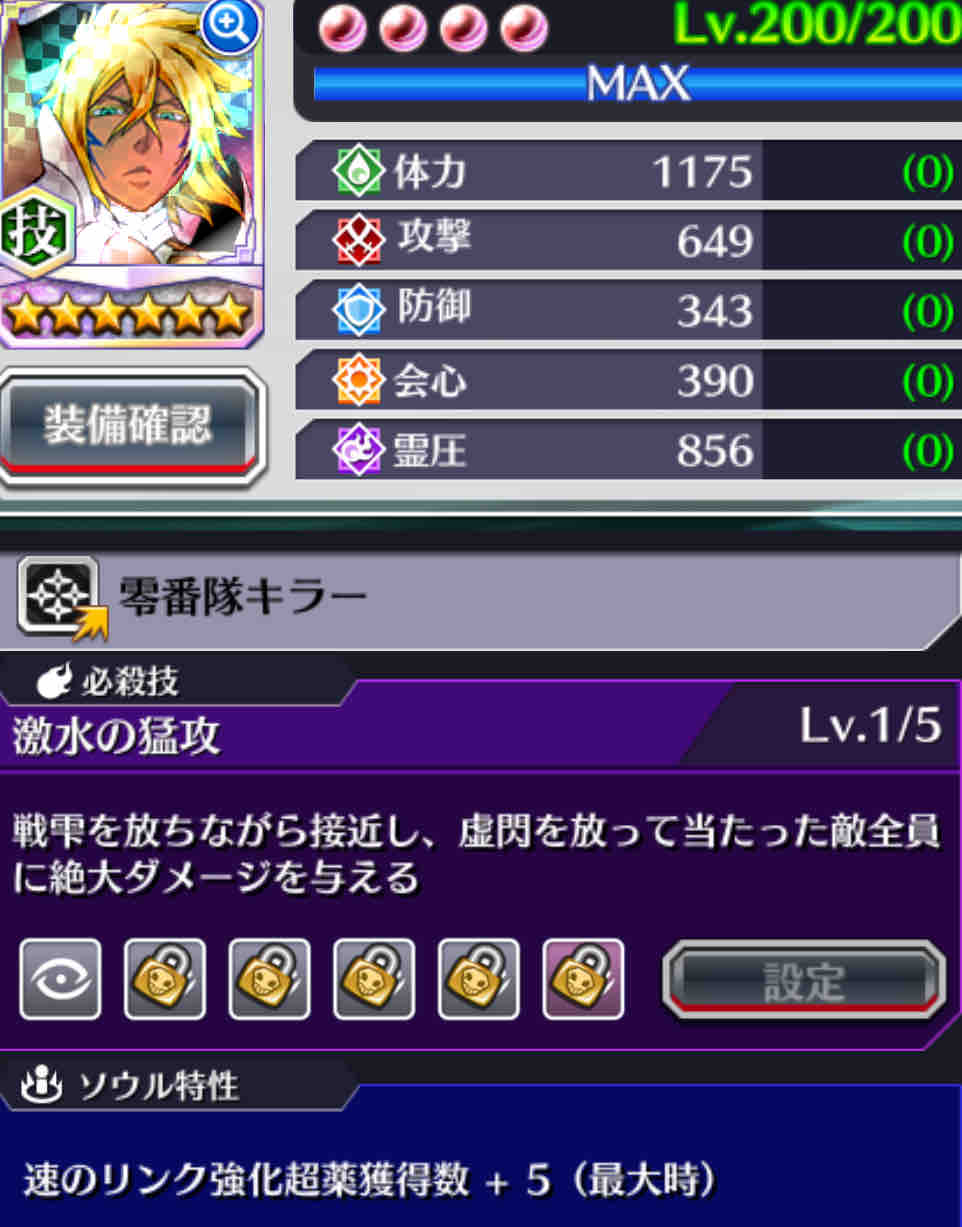 必殺技レベル5 ①霊圧 ②会心 ③攻撃 ④体力 ⑤防御