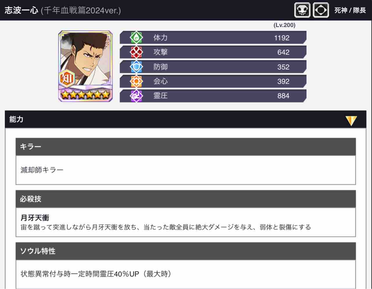 【破面への状態異常確率up】+【状態異常付与時一定時間霊圧120%up】+【敵麻痺状態時全ダメ40%up】+【チーム/パーティー:力属性滅却師が敵状態異常時全ダメ40%up】と基礎アビリティでかなりの火力を誇る。