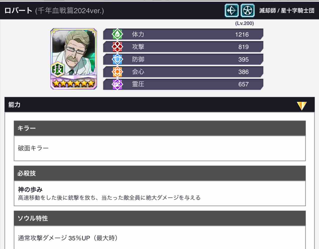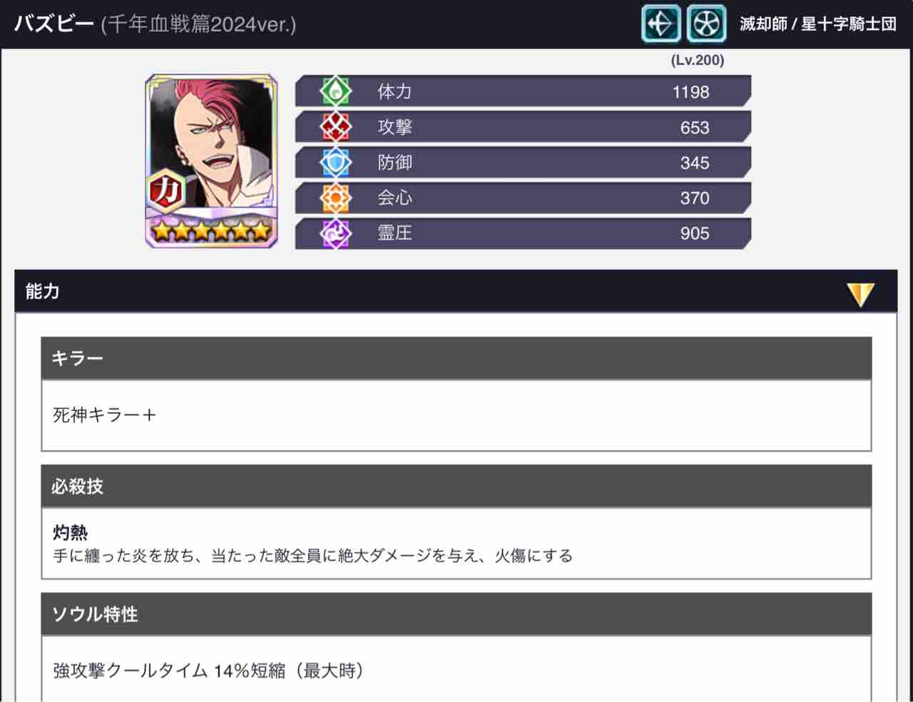 ただし、同じ死神キラー赤攻撃キャラである、卯ノ花八千流(千年血戦篇/2023)は扱いやすく、状態異常罠設置(弱体)+【敵撃破毎に全ダメ2%up(最大100%up)】など、火力も十分あるので、卯ノ花八千流の必殺技レベルと相談してからガチャを回すのを検討してもいいと思う。