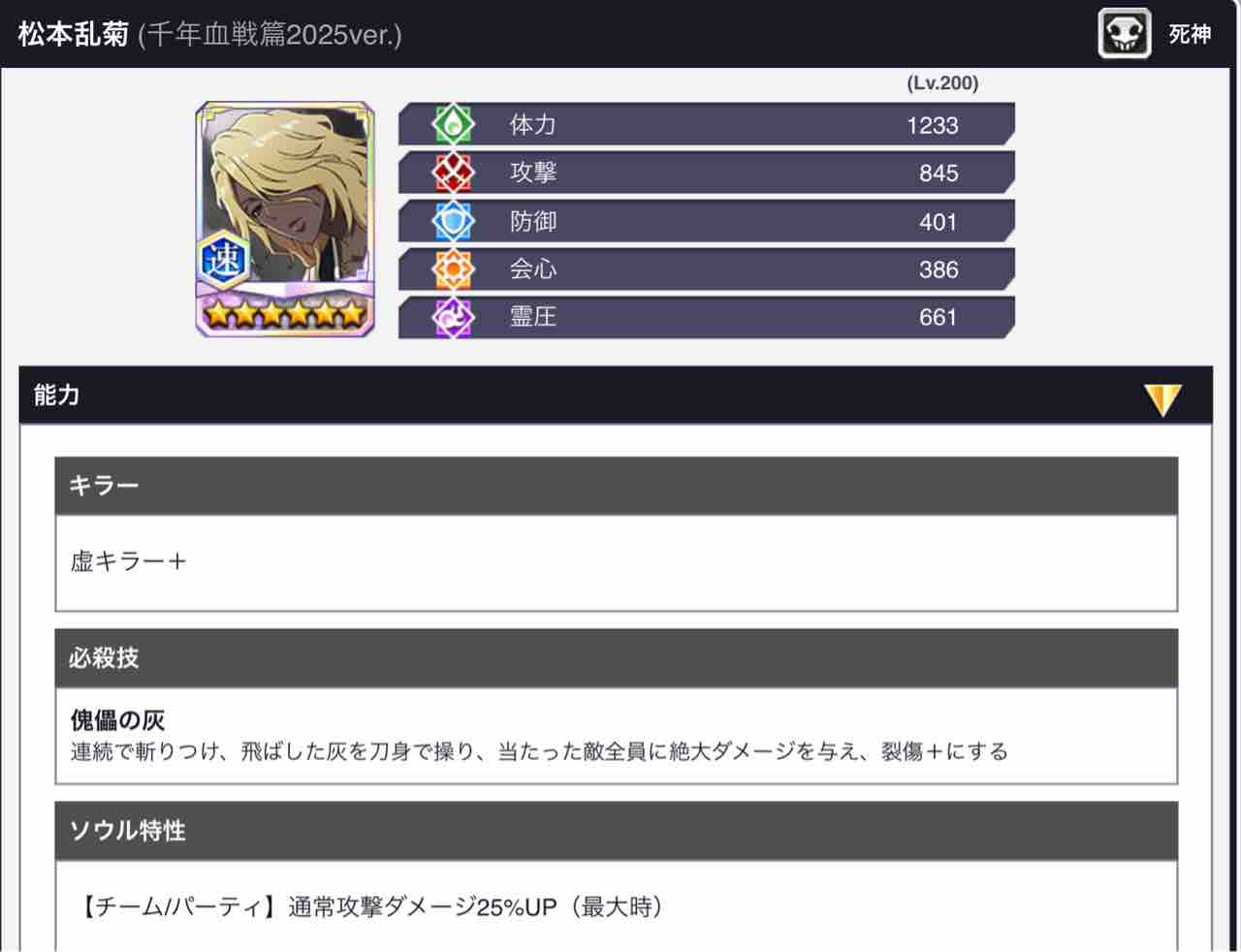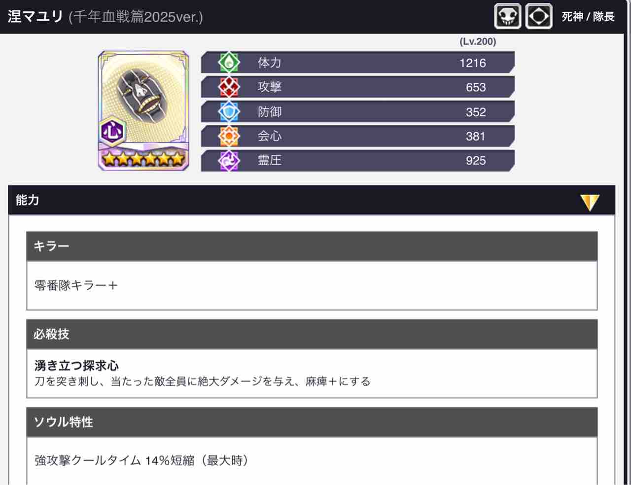 必殺技レベル5 ①攻撃 ②会心 ③体力 ④防御 ⑤霊圧