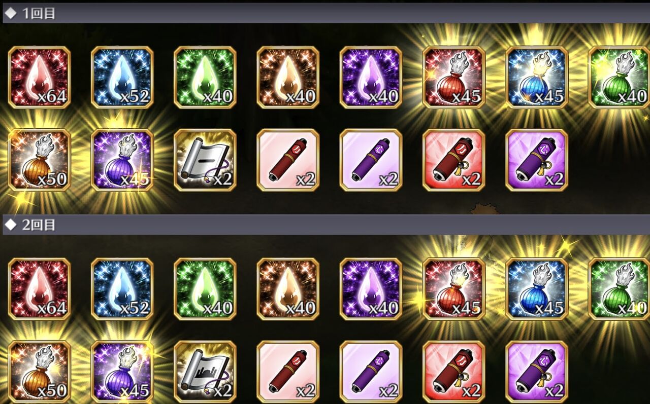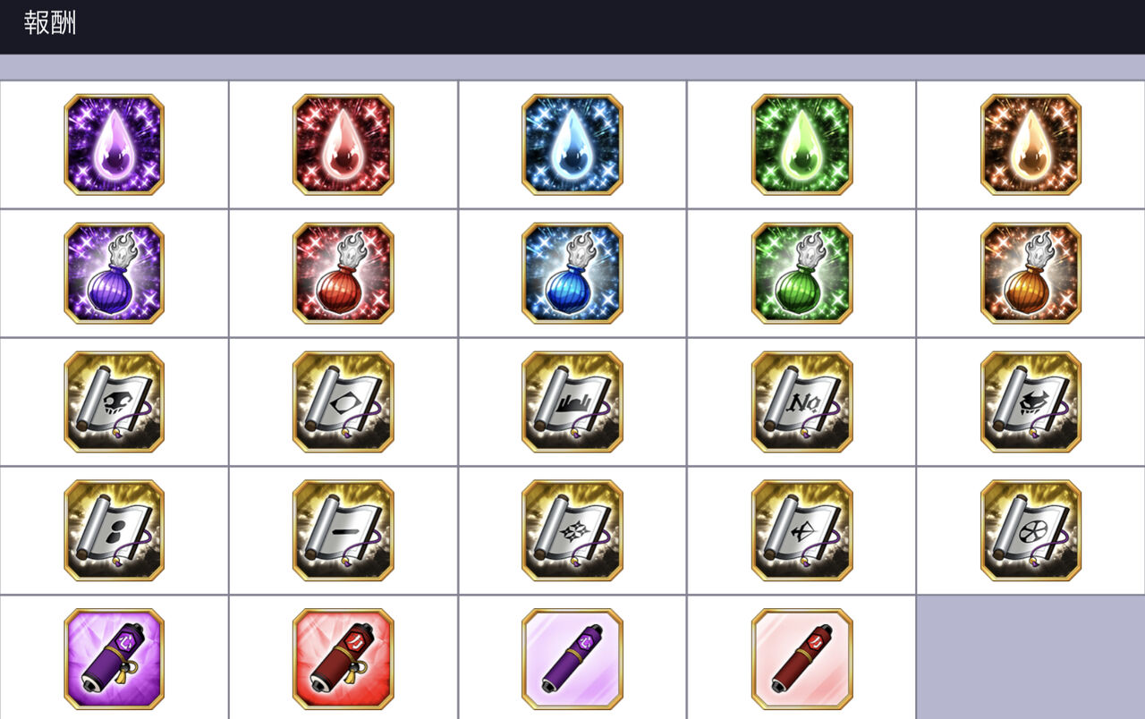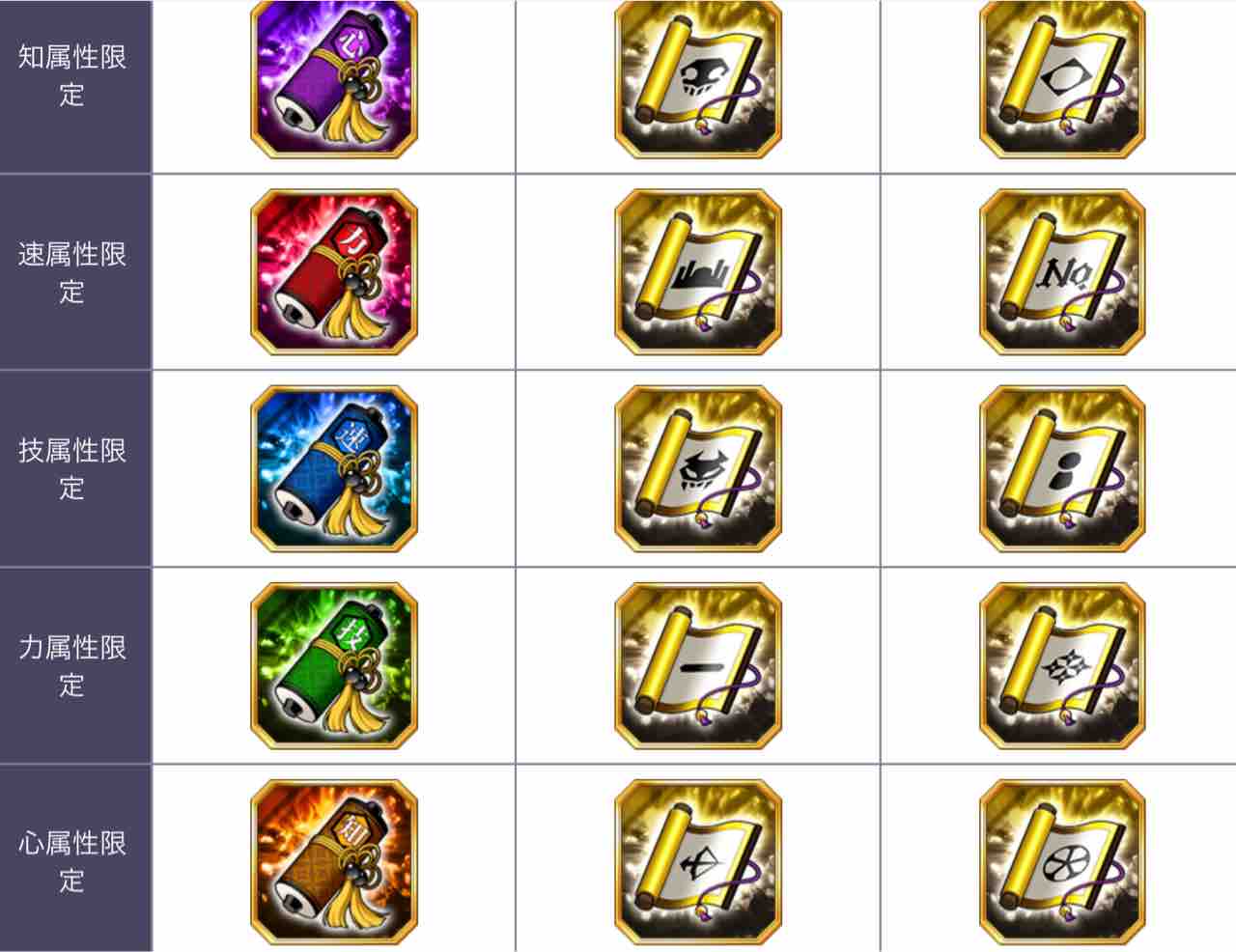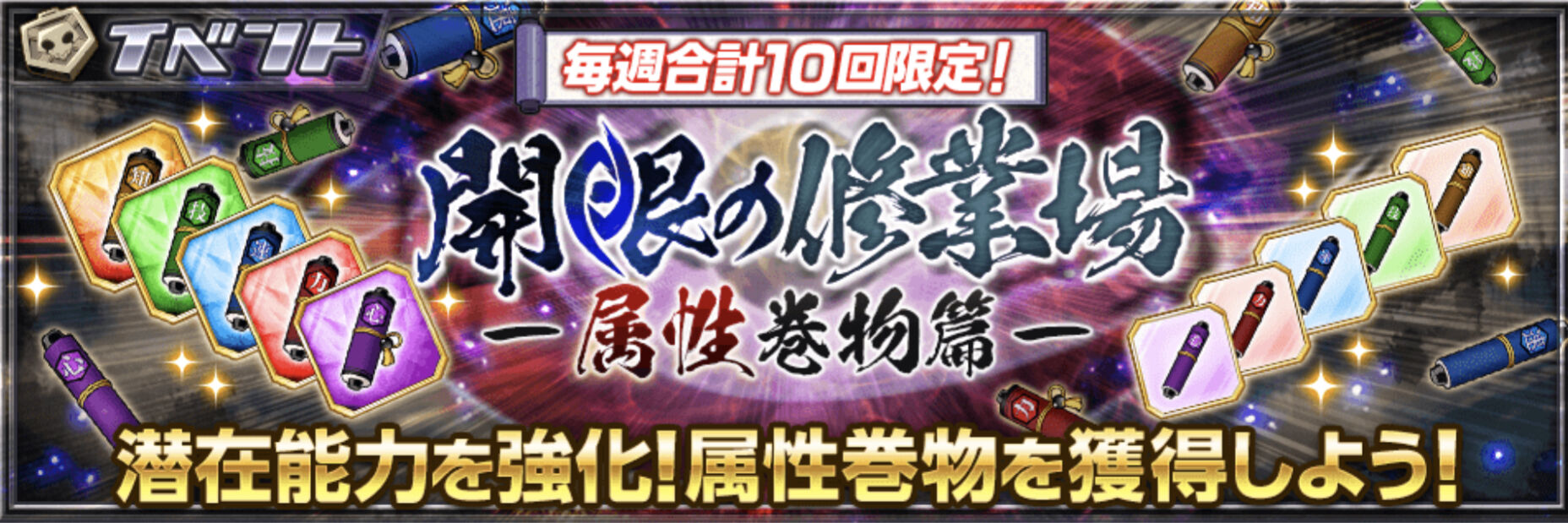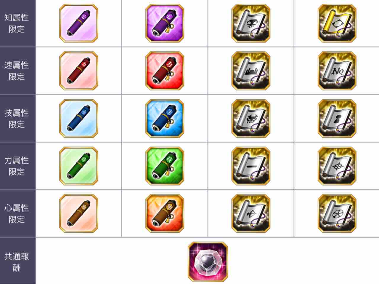 キャラの開眼に必要な属性巻物(大)、所属巻物(金)が手に入ります。